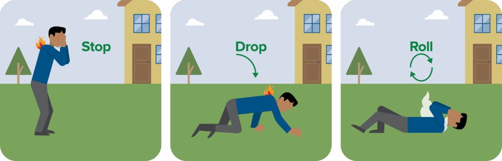 If your clothing catches fire, instinct might be to panic or run. This will cause flames to fuel themselves faster. That is why “Stop, Drop, & Roll” is still a lifesaving classic. The steps are simple: stop moving so flames don’t spread, drop to the ground and cover your face with your hands to minimize burning upward, and roll until the fire is out, cutting off oxygen flow to the flames. When done correctly, this technique can extinguish small fires effectively.